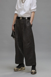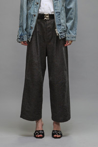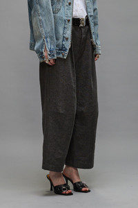 Pleated trouser featuring knee darts and pleats for expanded volume. Built with an Italian linen wool blend fabric. - Made in the USA - Color: Dark Grey - 59% Linen, 41% Wool - R13WR310-R399A