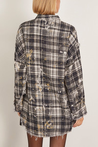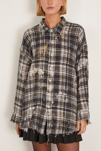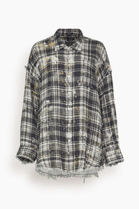 Shredded Seam Drop Neck Shirt in Black Plaid with Splatter