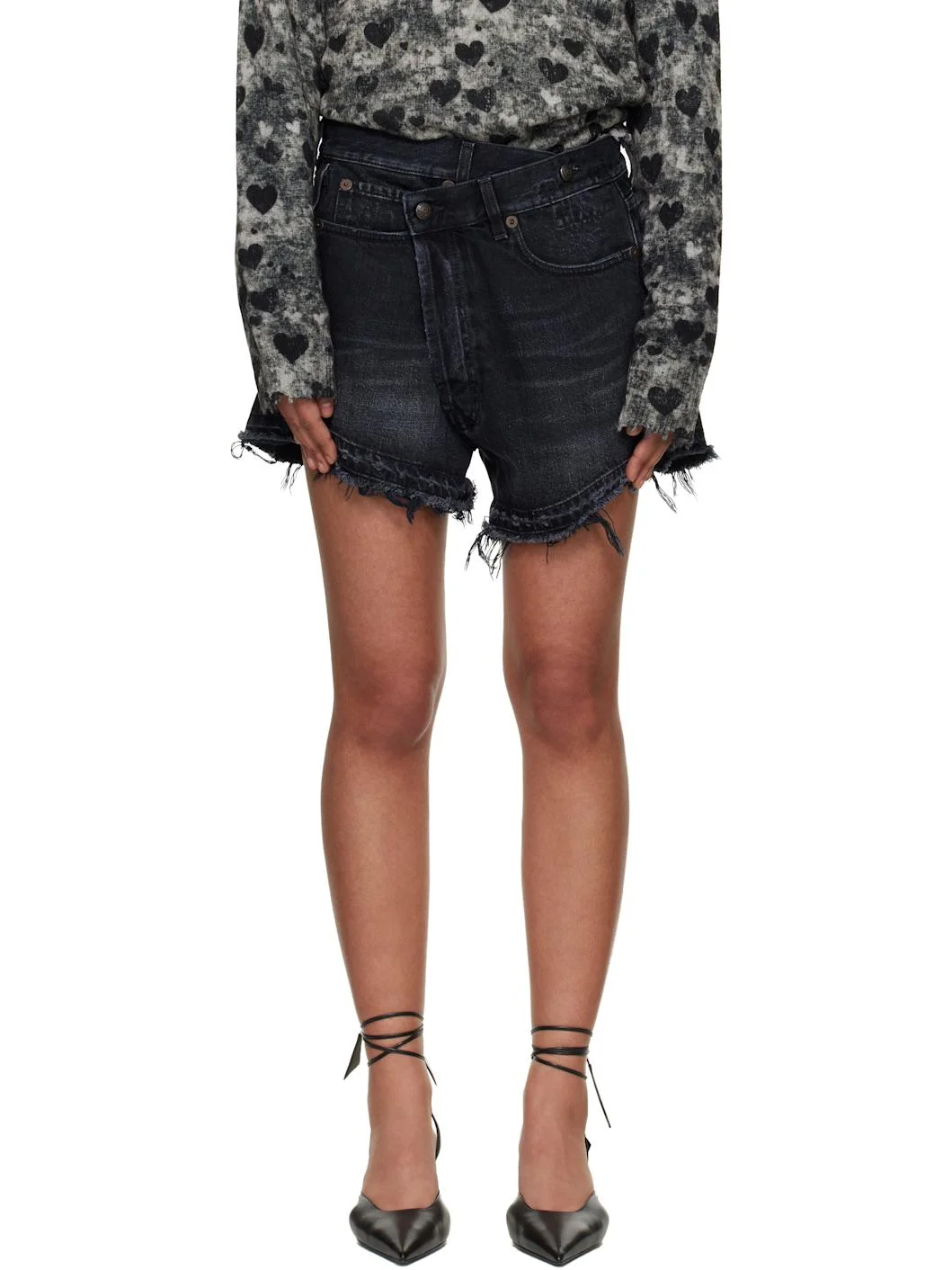 Non-stretch denim shorts. · Fading, whiskering, and subtle distressing throughout · Belt loops at offset waistband · Five-pocket styling · Zip fly · Frayed cuffs · Leather logo patch at back waistband · Dyed detailing at back pocket · Oxidized hardware Supplier color: Jake Black 100% cotton. Made in Italy 261021F088003