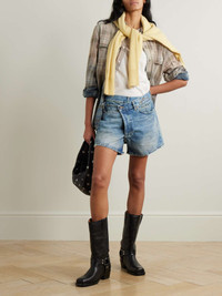 EDITORS'NOTES Each of R13's designs is imbued with a sense of rebellion. Made from faded and whiskered denim, these 'Crossover' shorts have an asymmetric waist and roomy legs with distressed hems. Show yours off with a tucked-in tee. SIZE & FIT Model measurements: - Fits true to size, take your normal size - Intended to be worn loose and low on the hips - Mid-weight, non-stretchy denim - Model is 175cm/ 5'9" and is wearing a size 26 - Bust: 81cm/ 32" - Waist: 62cm/ 24.5" - Hip: 89cm/ 35" DETAILS & CARE - Blue denim - Button fastening at front - 100% cotton; trim: 100% leather; lining 65% polyester, 35% cotton - Machine wash - Designer wash: Bain Blue