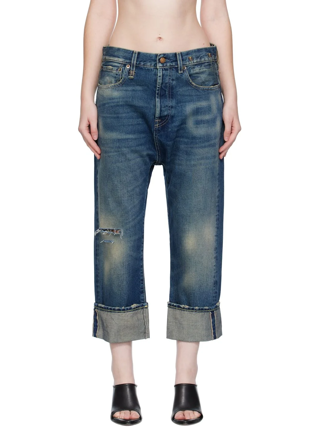 Non-stretch selvedge denim jeans. · Fading, whiskering, and distressing throughout · Loose-fit · Belt loops · Five-pocket styling · Button fly · Rips at knee · Rolled cuffs · Leather logo patch at back waistband · Logo-engraved antiqued gold-tone hardware · Contrast stitching in beige and tan Supplier color: Adelaide selvedge blue Body: 100% cotton. Trim: 100% leather. Pocket lining: 65% polyester, 35% cotton. Made in Italy 252021F069002