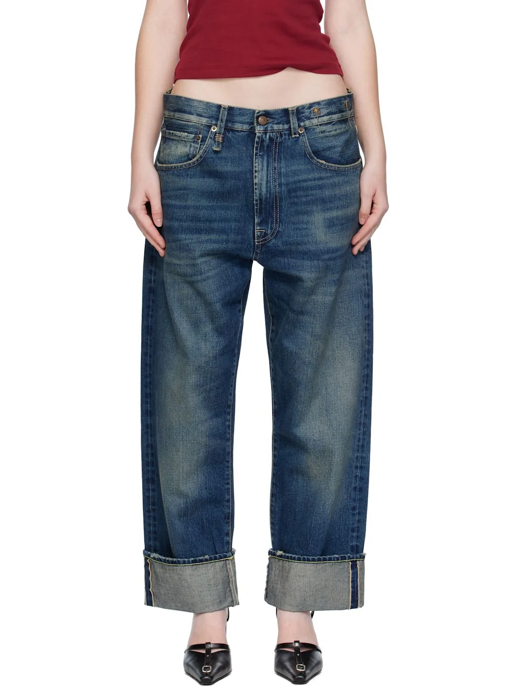 Non-stretch selvedge denim jeans. · Fading, whiskering, and distressing throughout · Straight-leg · Belt loops · Five-pocket styling · Zip fly · Rolled cuffs · Leather logo patch at back waistband · Logo-engraved antiqued copper-tone hardware · Contrast stitching in beige and tan Supplier color: Adelaide selvedge blue Body: 100% cotton. Trim: 100% leather. Pocket lining: 65% polyester, 35% cotton. Made in Italy 252021F069023
