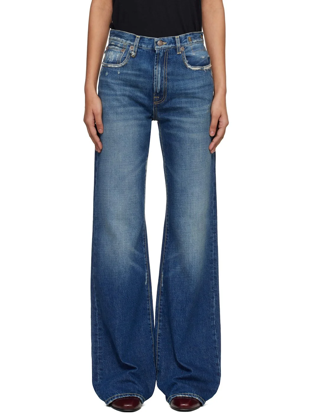 Non-stretch denim jeans. · Fading, whiskering, and distressing throughout · Belt loops · Five-pocket styling · Zip fly · Logo patch at back waistband · Contrast stitching in tan Supplier color: Oasis blue 100% cotton. Made in Italy 261021F069009