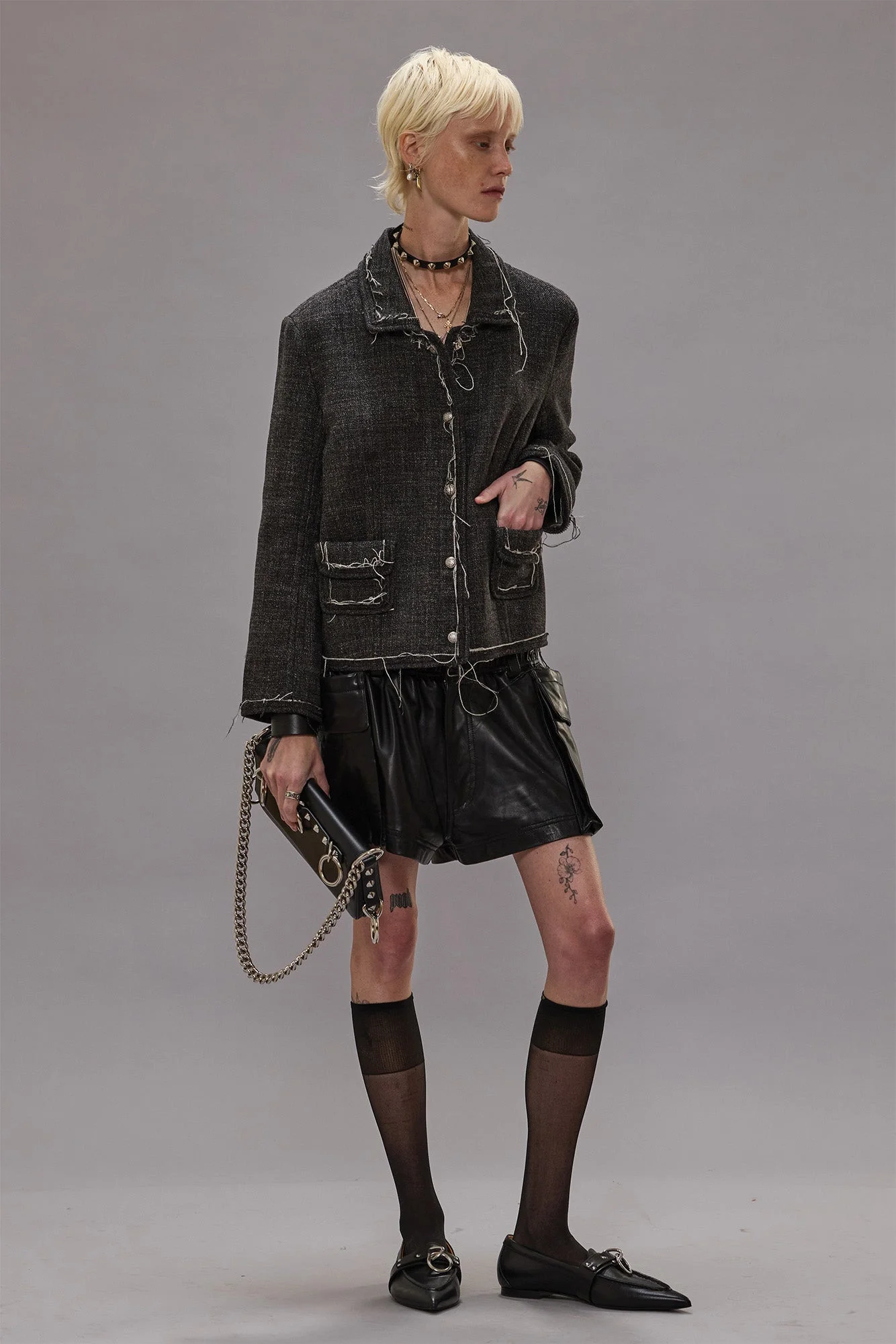 Fitted boxy jacket built with Italian double faced linen blended wool featuring raw edge finishing at the hems. DETAILS Made in the USA Color: Dark Grey 80% Virgin Wool, 20% Linen R13WR431-R561A