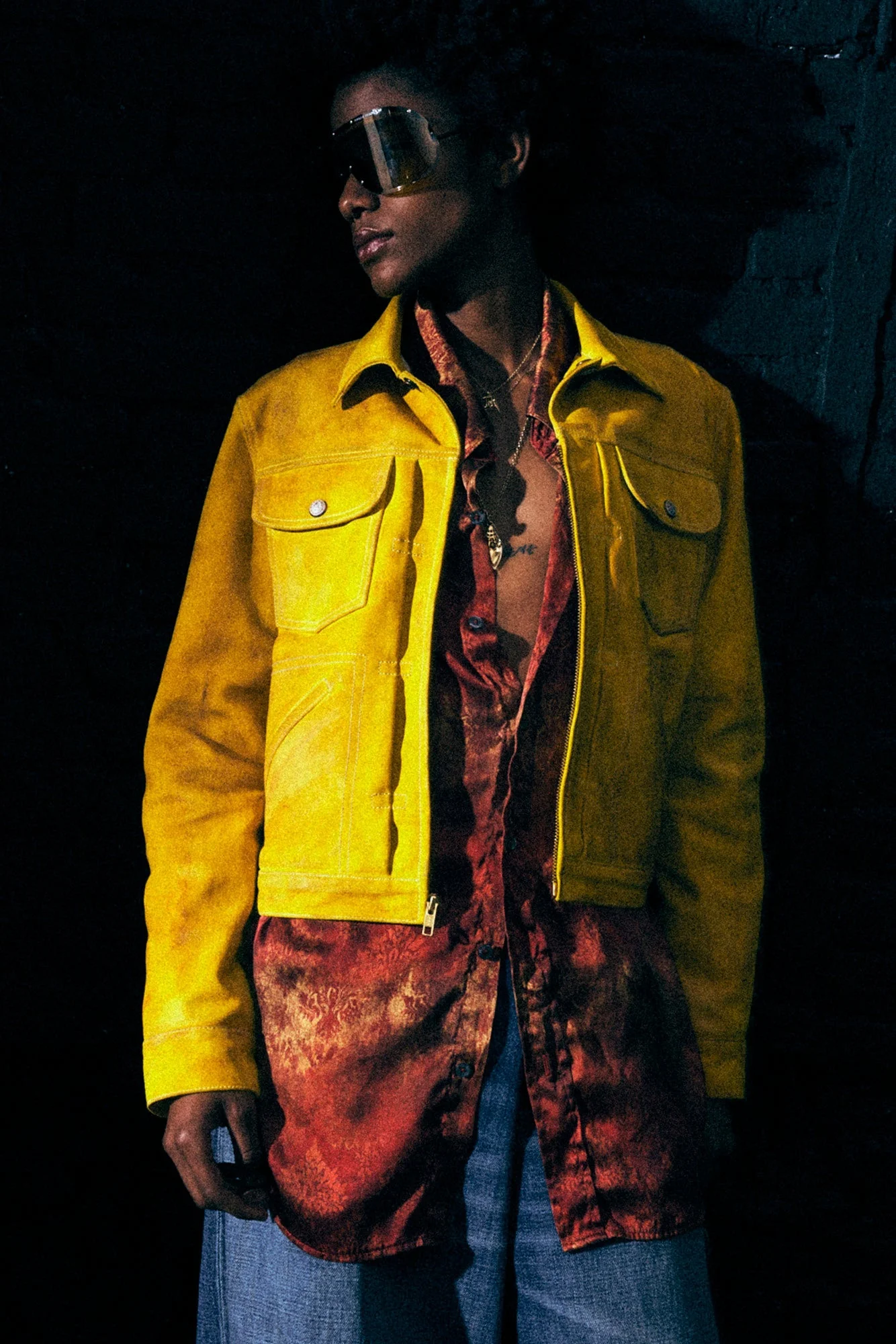 Slim fit trucker jacket built with yellow Italian suede and featuring classic trucker jacket detailing. DETAILS Color: Yellow 100% Suede R13WR550-R678A Imported