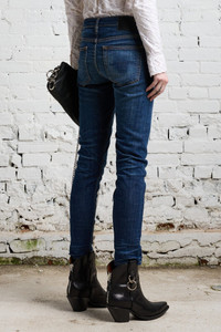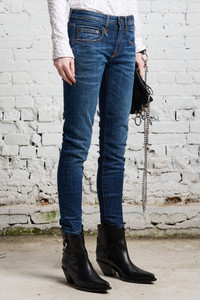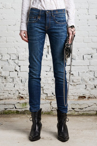- Color: Howell indigo - Blue wash; distressing at bottom hem - Low rise straight leg - Straight through the hip - Classic five pocket styling - Inseam: 26 3/4", Front Rise: 8 3/4", Back Rise: 13" - Model is 5'11" and wearing size 25 - Bust 34"; waist 24"; hips 35" - 98% Cotton, 2% Elastane - Machine wash cold, Do not tumble dry - Made in Italy - R13W0991-664C