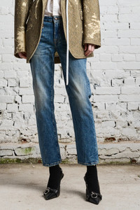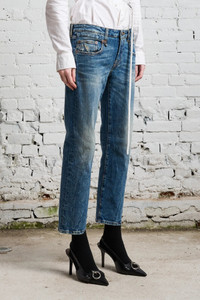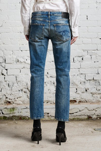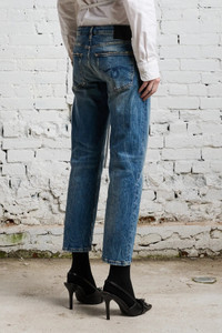Boy straight jean made with comfort stretch Italian indigo denim. - MADE IN ITALY - Color: Kelly Stretch - Olivia is 5’8” and wearing size 27 - Bust 32”; Waist 23”; Hips 34” - 98% Cotton, 2% Elastane - R13W0091-D081A