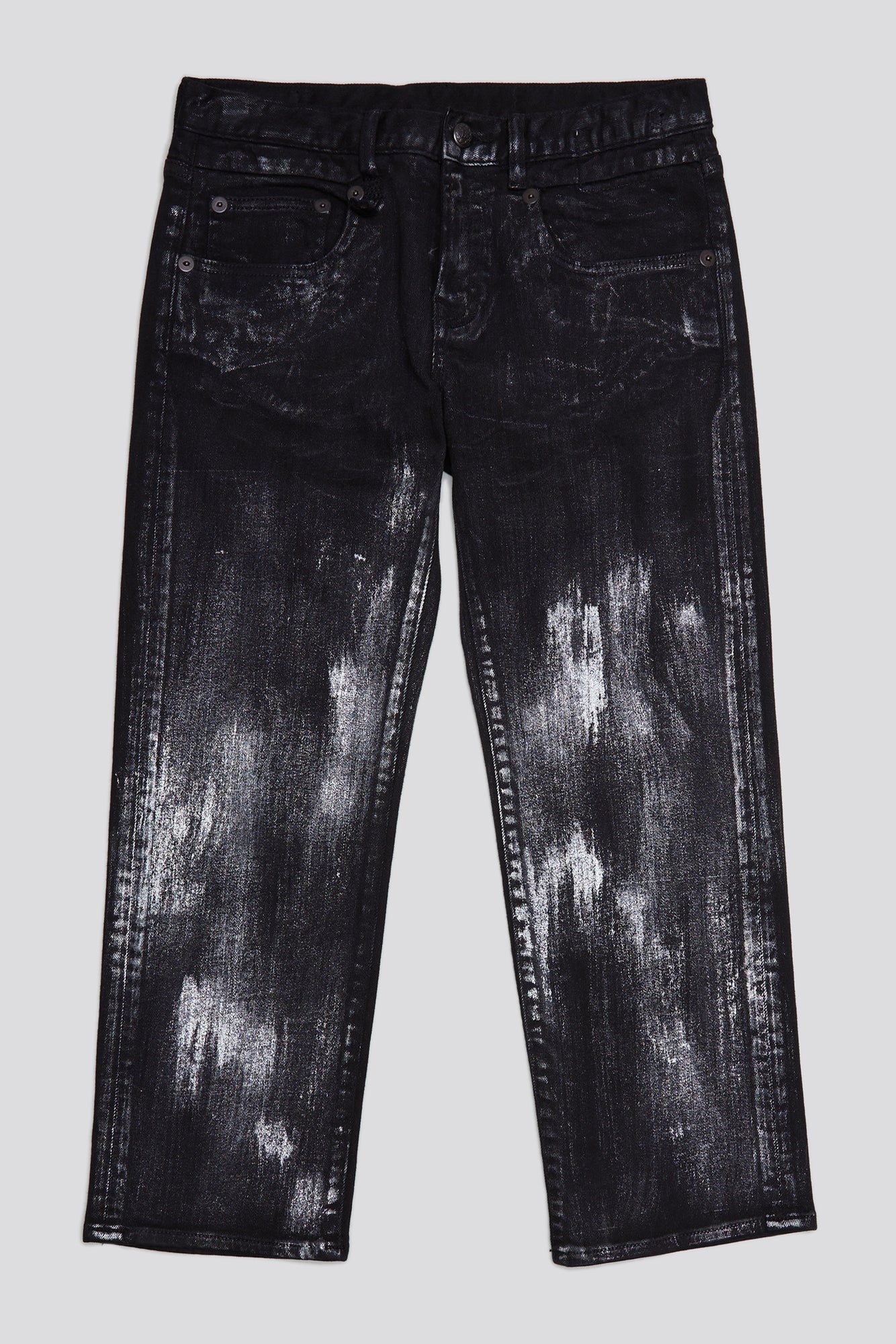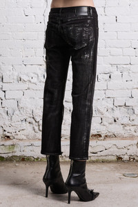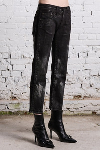 R13's iconic slim fit Boy Straight jean featuring a black overdye treatment and uneven silver leaf printing throughout.The finish of this garment will naturally weather over time. To promote longevity, wash inside out and avoid direct abrasion with the surface.Fits true to size. - Color: Silvered Black Stretch - 98% Cotton, 2% Polyurethane - R13W0091-D181A - Imported