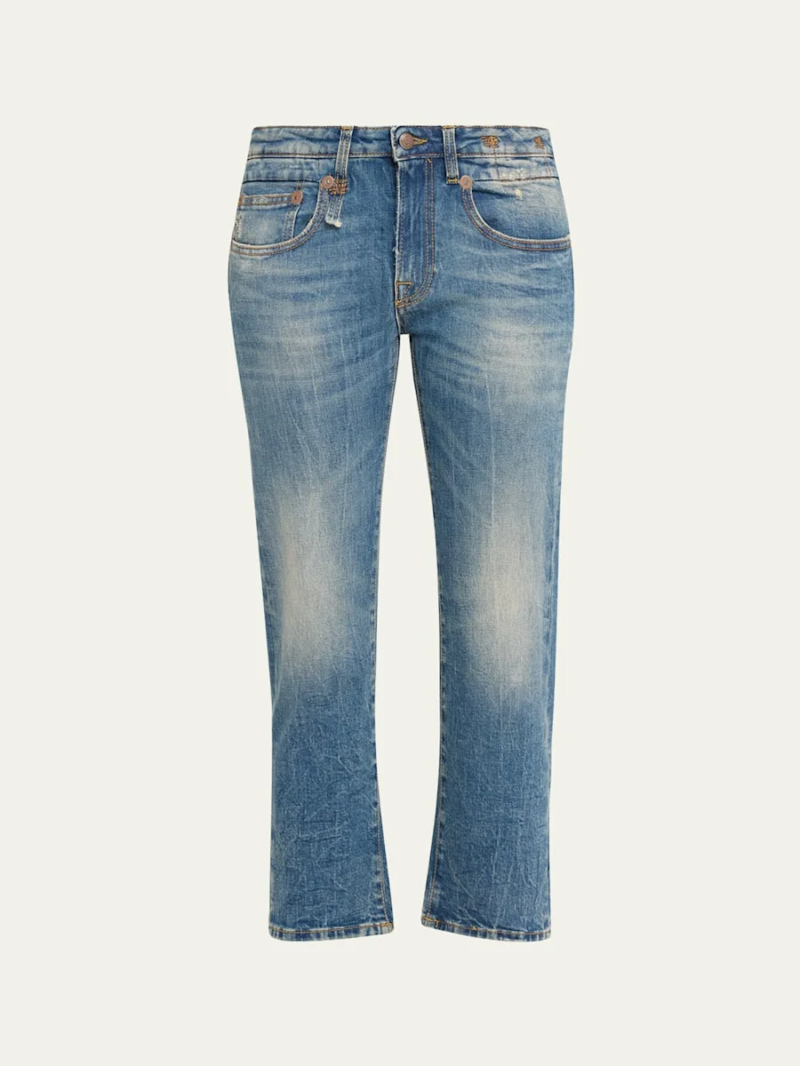 R13 "Boy" straightleg jeans in faded mediumwash denim Midrise; sits high on hip Fivepocket style Slim fit Cropped length Button/zip fly; belt loops Cotton/spandex Made in Italy