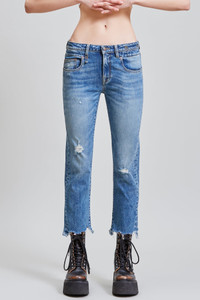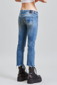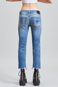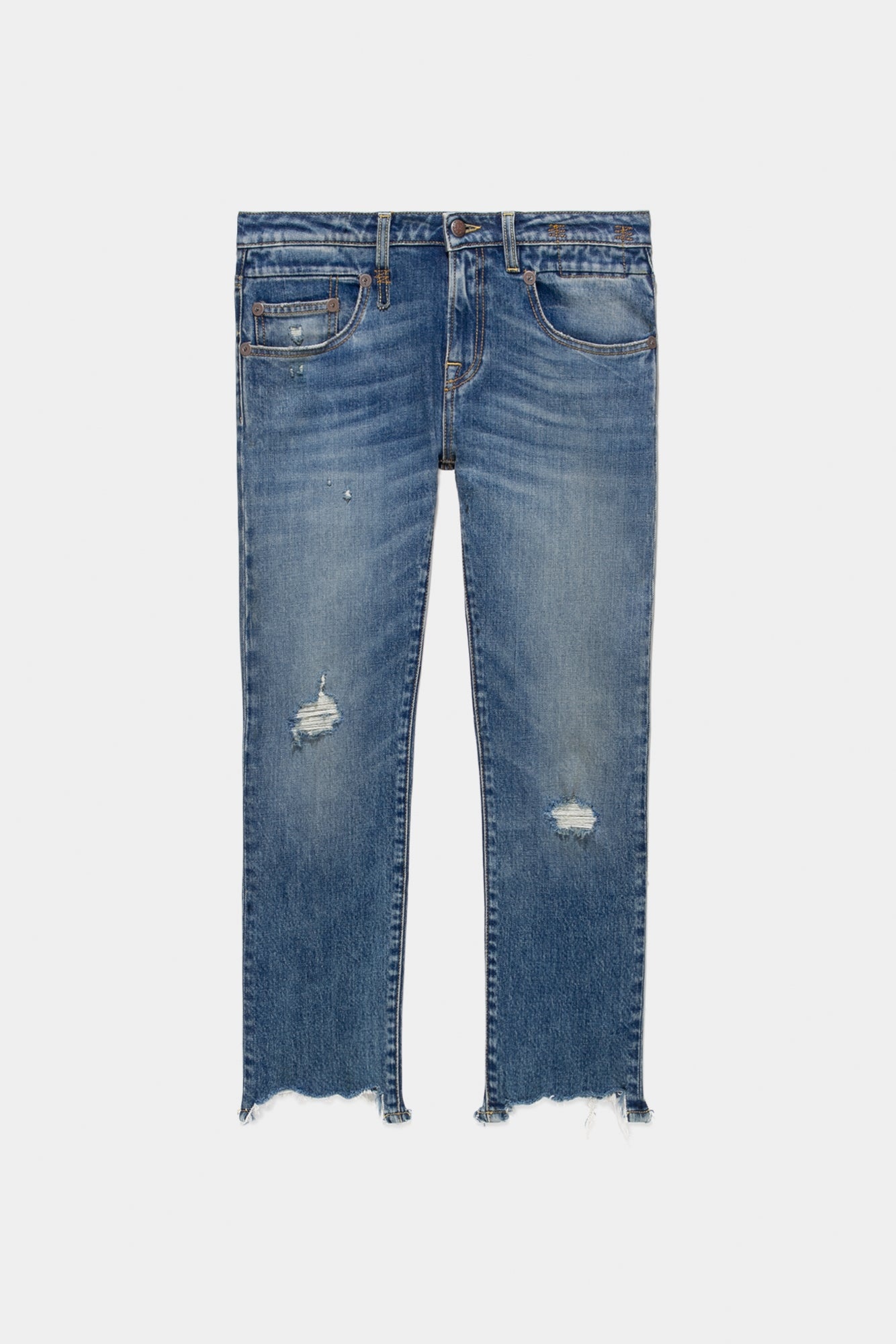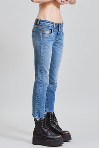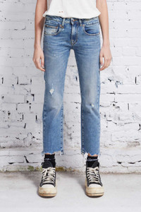 Cropped straight skinny jean with rips and frayed hem. Made with comfort stretch Italian indigo denim fabric. Medium vintage blue wash with slight distressing. - Color: Carlton - Classic five pocket styling - True to size - Model is 5’10” and wearing size 25 - Inseam 25 1/4"; Front Rise 8 7/8"; Back Rise 13" - Bust 34”; waist 24”; hips 35” - 98% Cotton 2% EA - Machine wash cold, Do not tumble dry - Made in Italy - R13W0091-676B