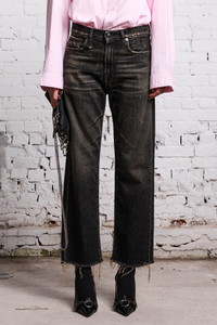 Classic straight leg Boyfriend jean featuring comfort stretch denim, a vintage black wash, mild abrasions and a cut off hem. - MADE IN ITALY - Color: Abbey Black - Sasha is 5’10” and wearing size 27 - Bust 32”; Waist 23”; Hips 35” - 92% Cotton, 8% T400 - R13W5083-D152B