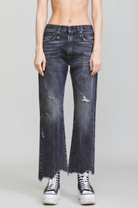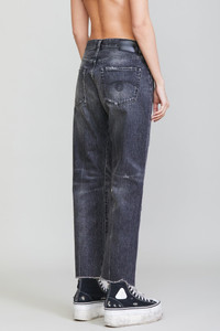 Classic Boyfriend jean featuring rigid Italian black on black denim and a mildly worn dark black wash with mild abrasions and a hand cut, uneven hem. - MADE IN ITALY - Color: Everit Black - Skye is 5’11” and wearing size 27 - Bust 30.5”; Waist 24”; Hips 35” - 100% Cotton - R13W5083-D014D