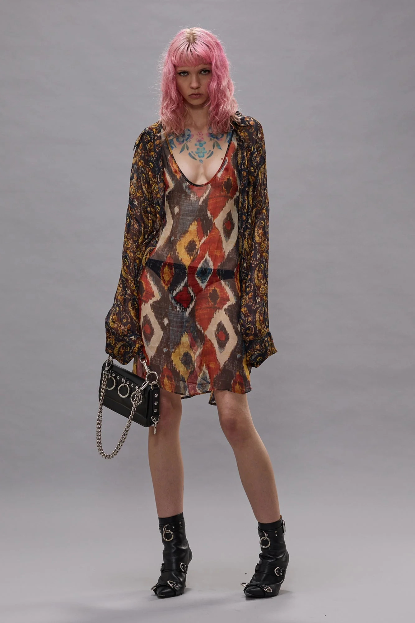 Printed chiffon set consisting of a cardigan over a slip dress. Built from silk fabric. DETAILS Made in the USA Color: Yellow Multicolor Combo 100% Silk R13WR601-R737A