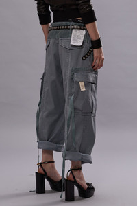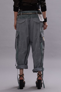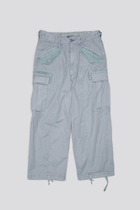 Cropped ankle length cargo pants featuring extra seaming details at the front and back legs and corduroy contrast blocks on the pockets and upper back. Built with faded Japanese canvas and treated with a simple garment wash. - Color: Faded Steel Blue Canvas - 100% Cotton - R13WD320-D279A - Imported