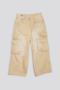 Cropped wide leg jean featuring a pleated waist, knee darts and cargo pockets across the leg. The fabric is constructed of luxe Zimbabwe cotton and the Faded Wheat color is achieved with a special sulfur rope dying treatment that creates authentic vintage fading over time. - Color: Faded Wheat - 100% Cotton - R13WD246-D235A - Imported