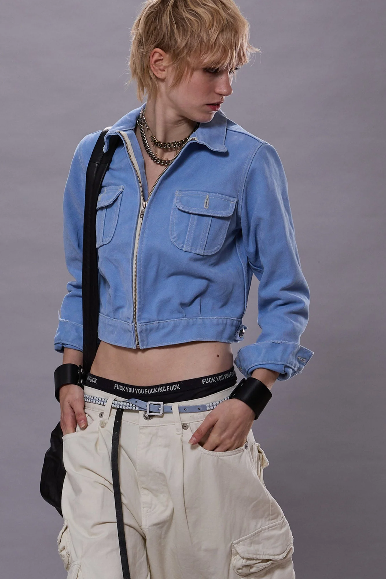 Fitted cropped rider jacket with double pleats towards waistband at the front of garment and a single pleat at the back. Made with cotton, 19.5oz, Sky Blue Duck Canvas. DETAILS Color: Sky Blue Duck Canvas 100% Cotton R13WD174-D320A Imported