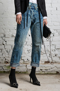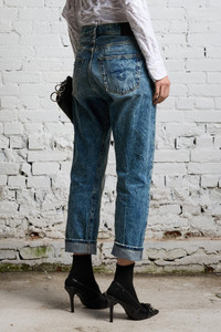 This style runs slightly large. If in between sizes, we recommend sizing down. - Color: Kelly - Straight leg jean - Crossover button closure - Classic five pocket styling - Model is 5’11” and wearing size 25 - Bust 34”; waist 24”; hips 35” - Italian Denim - 100% Cotton - Machine Wash - Made in Italy - R13W2048-734