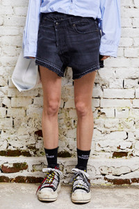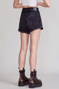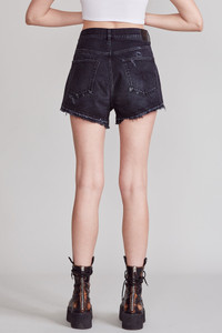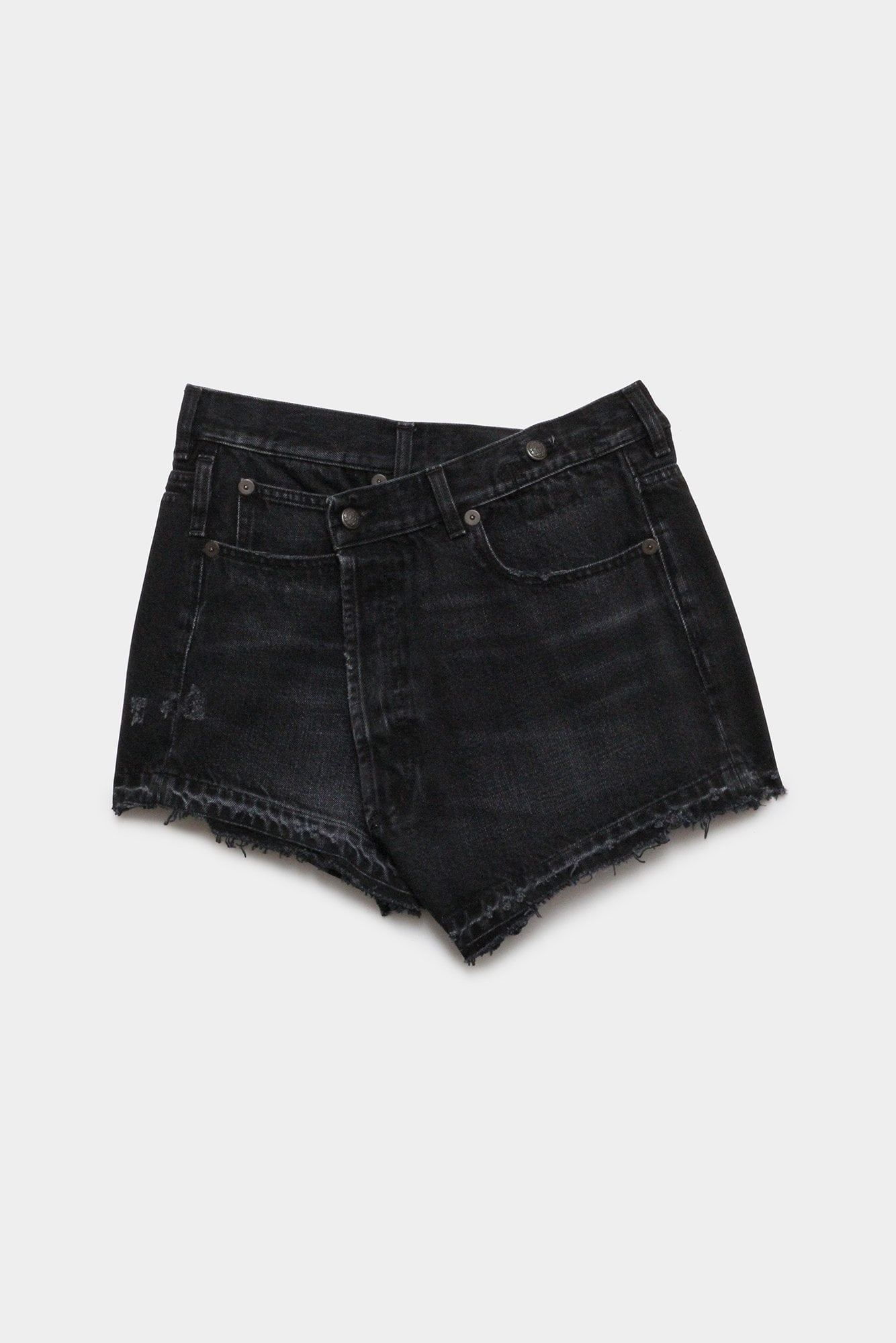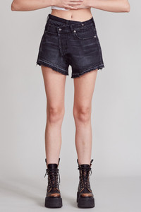 Crossover shorts with a black wash. Made with distressed Italian black denim fabric and features a let down hem. - Color: Jake Black - Model is 5'11"; wearing a size 25 - Bust 34"; waist 24"; hips 35" - 100% Cotton - Machine wash cold; Do not tumble dry - Made in Italy - R13W6055-394B