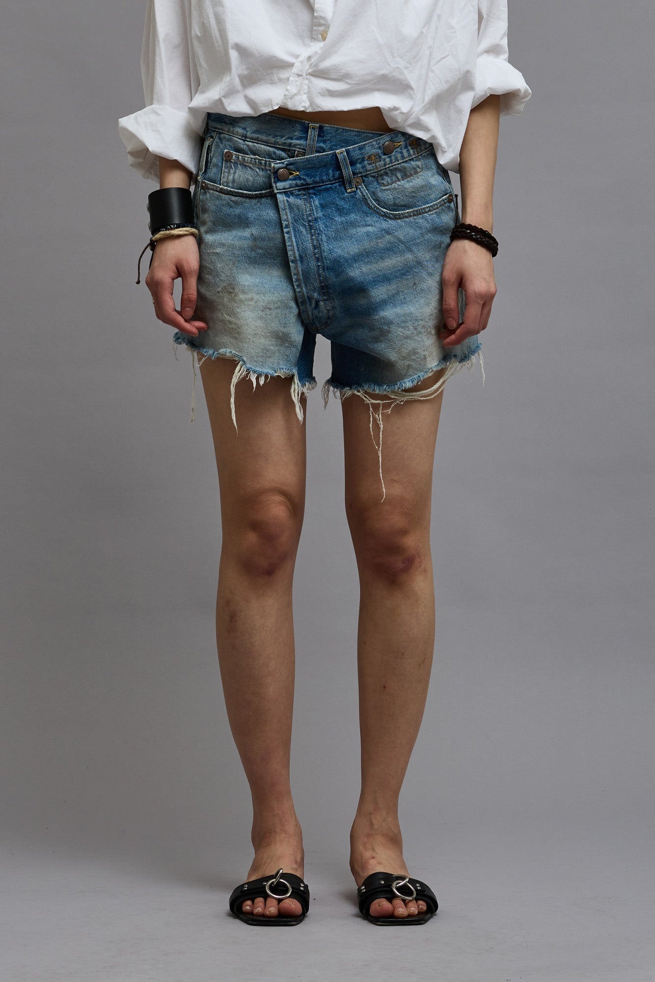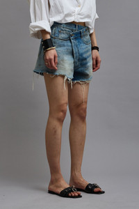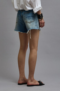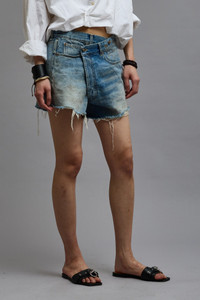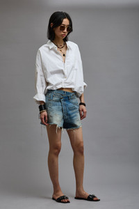 Crossover short made with rigid 13 oz. denim and a medium dark vintage indigo wash.This style runs slightly large. If in between sizes, we recommend sizing down. - MADE IN ITALY - Color: Turner Blue - Reese is 5'11" and wearing size 25 - Bust 30"; Waist 23"; Hips 34" - 100% Cotton - R13W6055-D111D