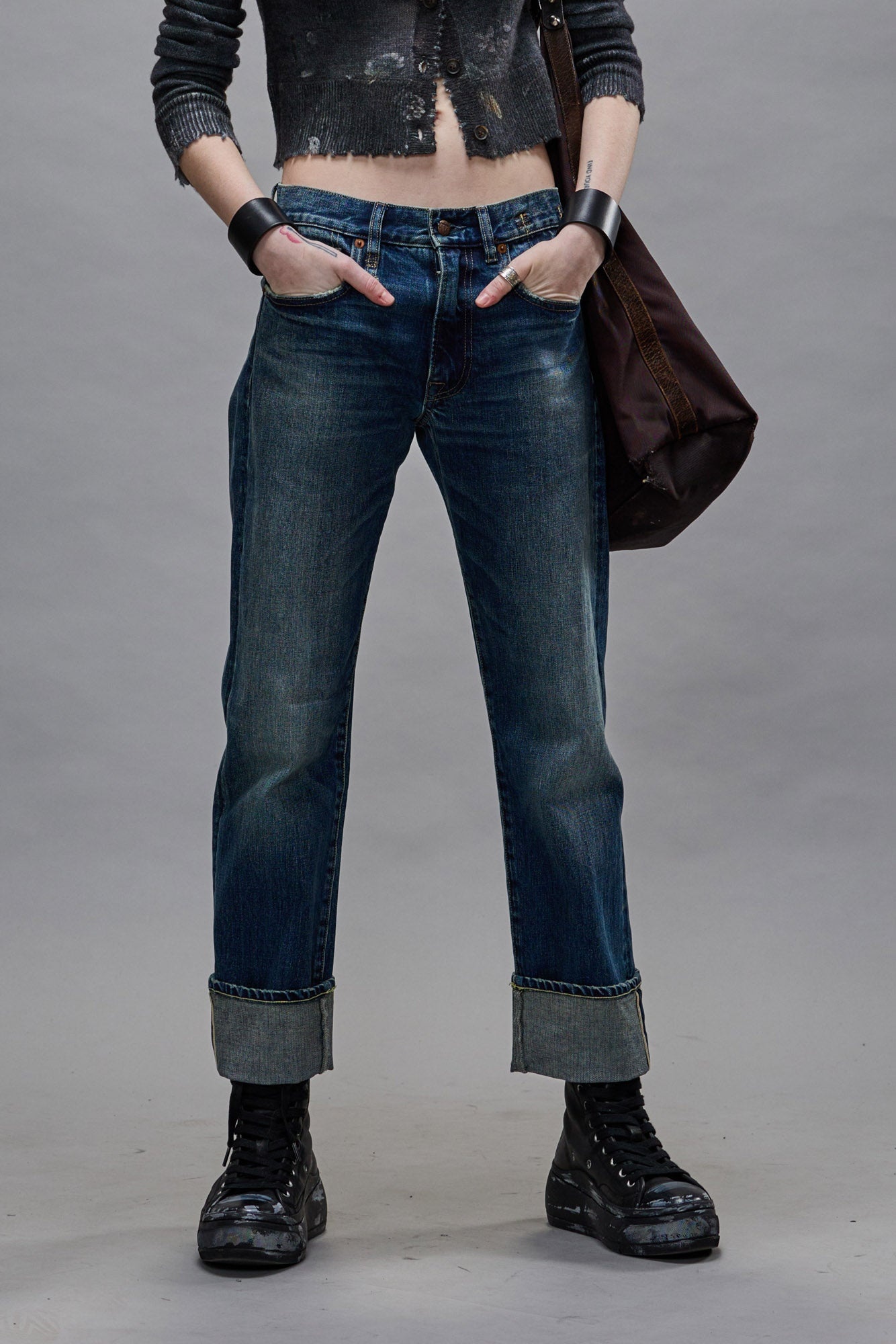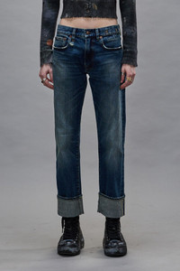 Classic slim fit Romeo Jean featuring a large cuff with an uneven frayed hem. Built with R13's finest selvedge denim, with a horsehide patch, exclusive brass trims and numbered interior production label.FITS TRUE TO SIZE. - Color: Caslon Selvedge Blue - 98% Cotton, 2% Polyurethane - R13WD113-D160A - Imported
