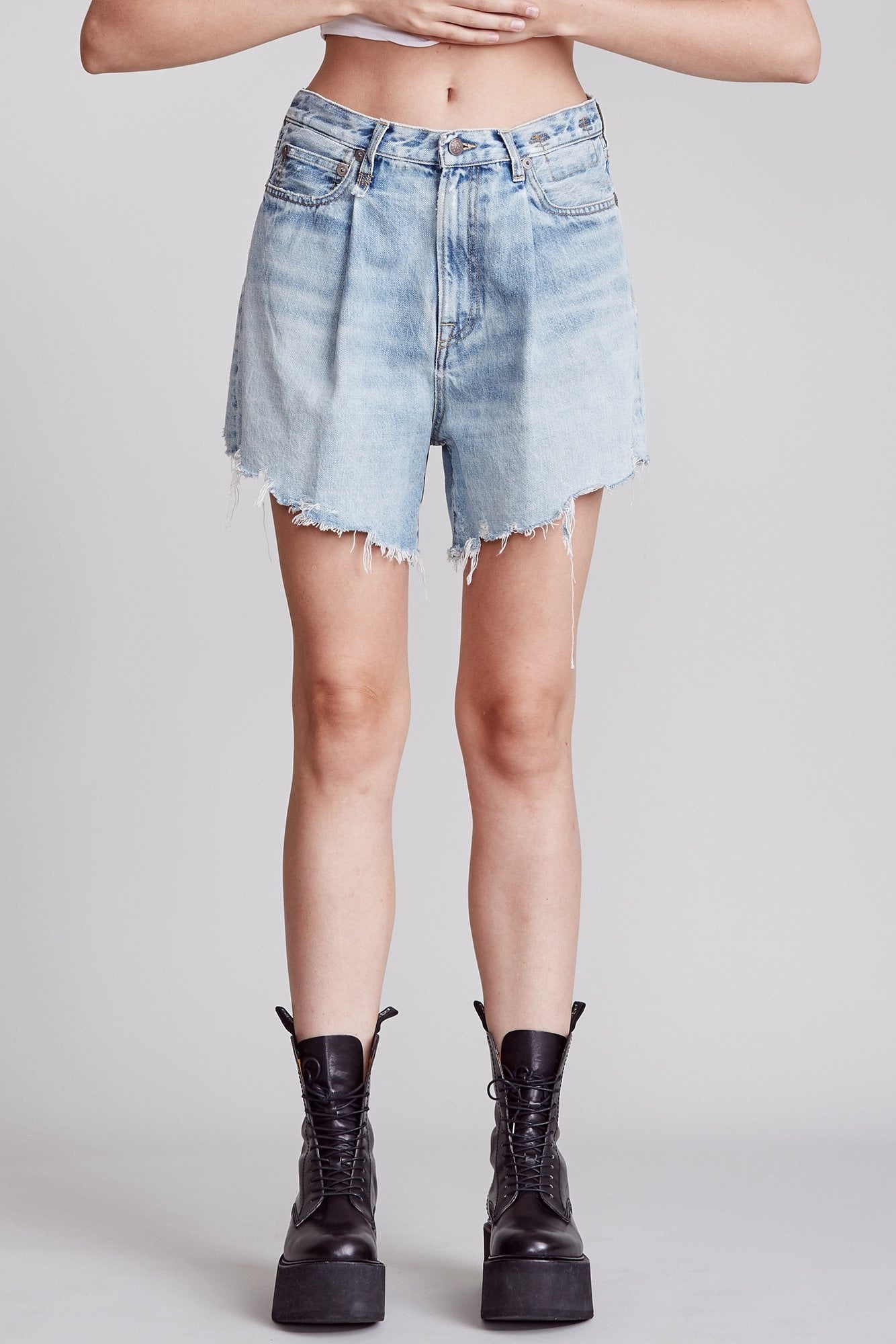 - MADE IN ITALY - Color: Lennon Blue - Pleated wide-leg short made with Japanese selvedge denim denim in a light indigo vintage wash with mild distressing & frayed hem - Mid rise Short - Relaxed fit with unfinished shredded hem - Classic five pocket styling - Model is 5’11” and wearing size 25 - Bust 34”; waist 24”; hips 35” - Inseam 5" Front Rise 12 1/2" Back Rise 16" - Japanese Fabric - 100% Cotton - Machine wash cold, Do not tumble dry - R13W3148-897B