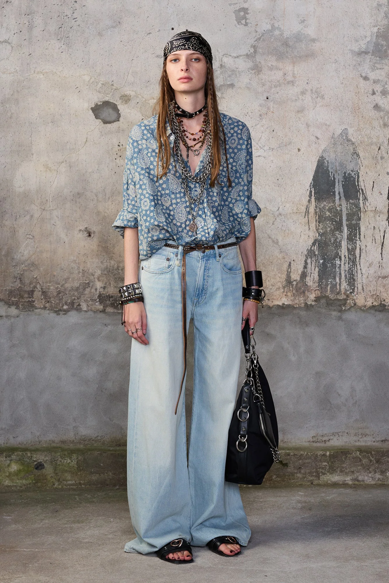 Relaxed wide leg five pocket jean with flared leg made with 8.5 oz. Japanese rigid indigo denim and a light indigo wash with a mild wear pattern. DETAILS Color: Lennon Blue 100% Cotton R13WD229-D897A Imported