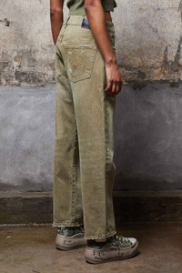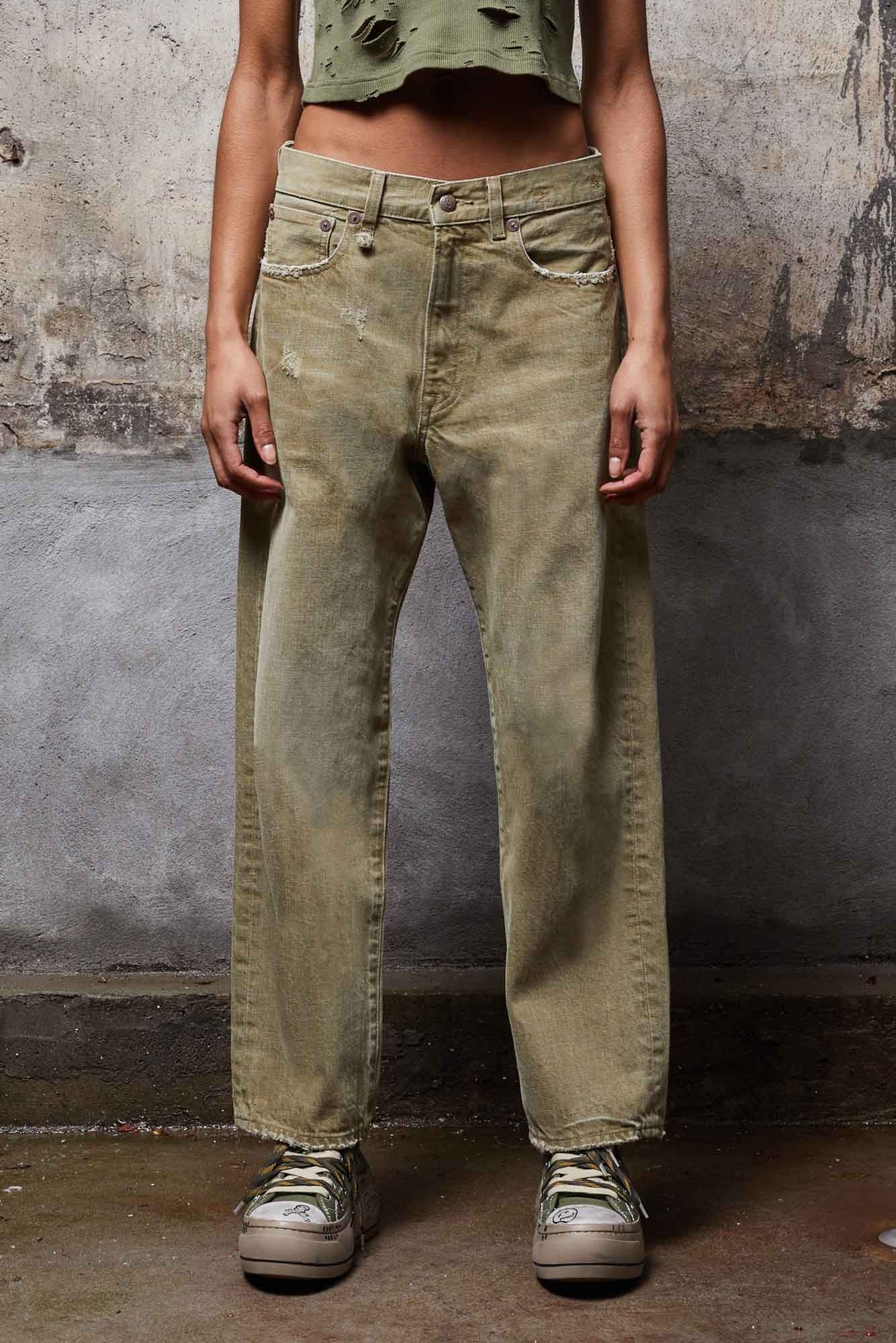 Classic Boyfriend jean made with 14 oz. Japanese olive denim. The moss green wash is achieved with rope sulfur dye, a treatment that causes the fabric to fade like regular Indigo denim. - MADE IN ITALY - Color: Moss Green - Lizette is 5 8 and wearing size 27 - Bust 31 ; Waist 23 ; Hips 34 - 100% Cotton - R13W5083-D090A