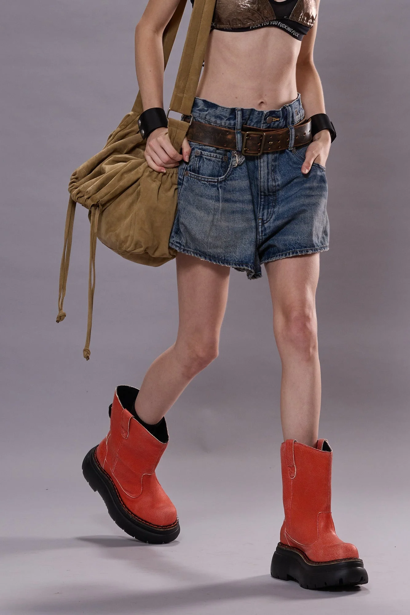 Relaxed baggy shorts with a low drop crotch and dual belt loops for flexible styling and pleats below the pockets for fullness. B uilt with mid-weight Japanese rigid indigo denim and treated with a medium indigo wash and mild wear pattern. DETAILS Color: Barter Indigo 100% Cotton R13WD116-D213A Imported