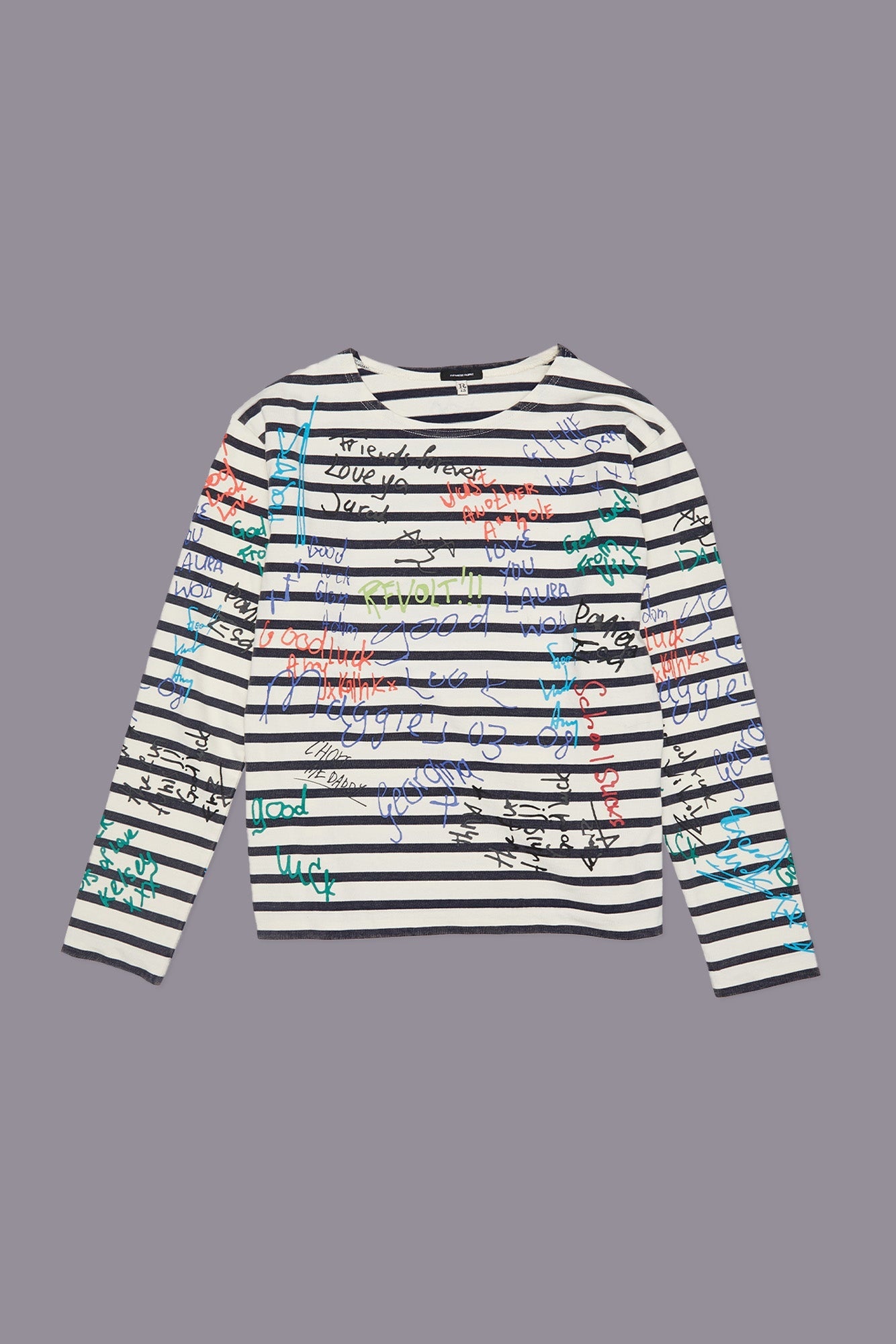 Long sleeved stripe T with an End of the Year graphic printing all throughout. DETAILS Color: Vandalized Navy Stripe 100% Cotton R13W3061-001BK Imported