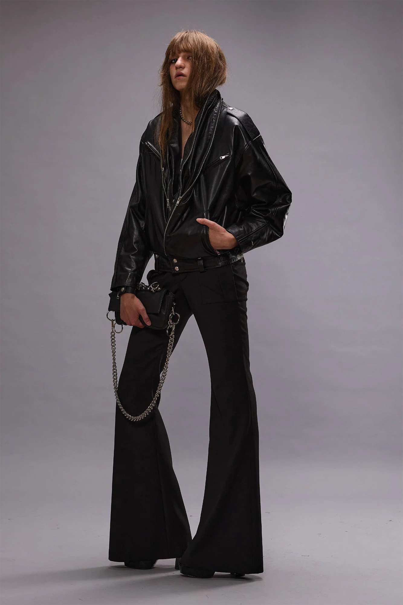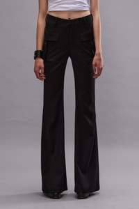 Fitted trouser pant featuring an extended flared leg designed to pool at the feet. - Made in NYC - Color: Black - 67% PL, 31% VI, 2% PU - R13WR366-R475A