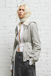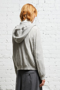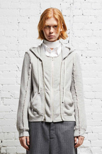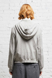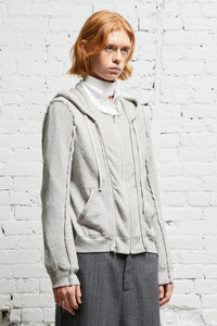A twist on the classic Zip Hoodie featuring flat sleeves and a double zipper closure at the front. Two separate pieces of cloth are sewn together to create the flat sleeve effect and the interior zipper can be folded inwards if desired. Raw, exposed seams accent the garment for a distressed look. - Color: Heather Grey - 100% Cotton - Julia is 5'10" and wearing size M - Bust 32"; Waist 24"; Hips 35" - R13WK159-K001H - Imported