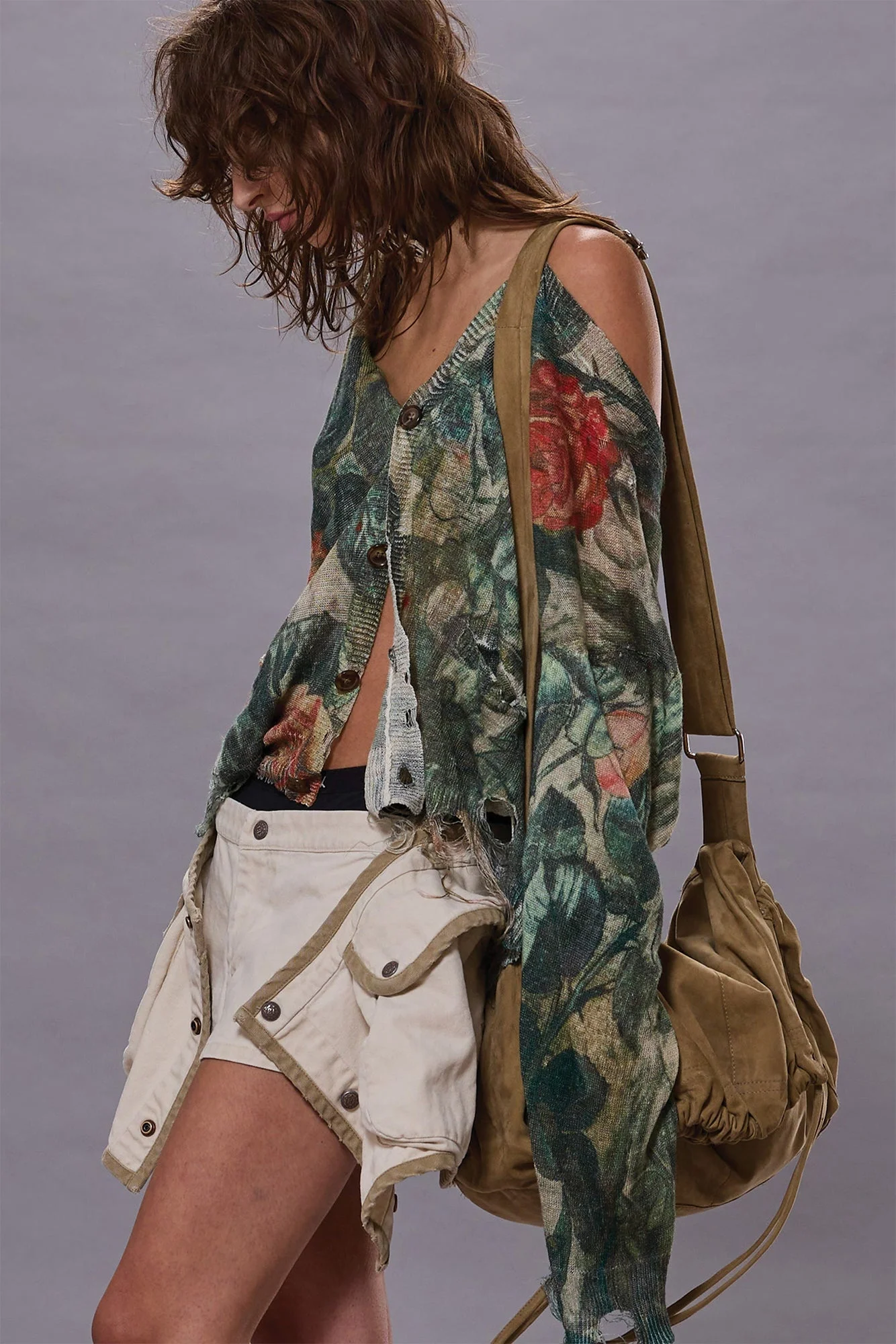 Relaxed fit linen cardigan featuring heavily distressed edges and a camo rose print. DETAILS Color: Camo Rose 100% Linen R13WY200-Y182B Imported