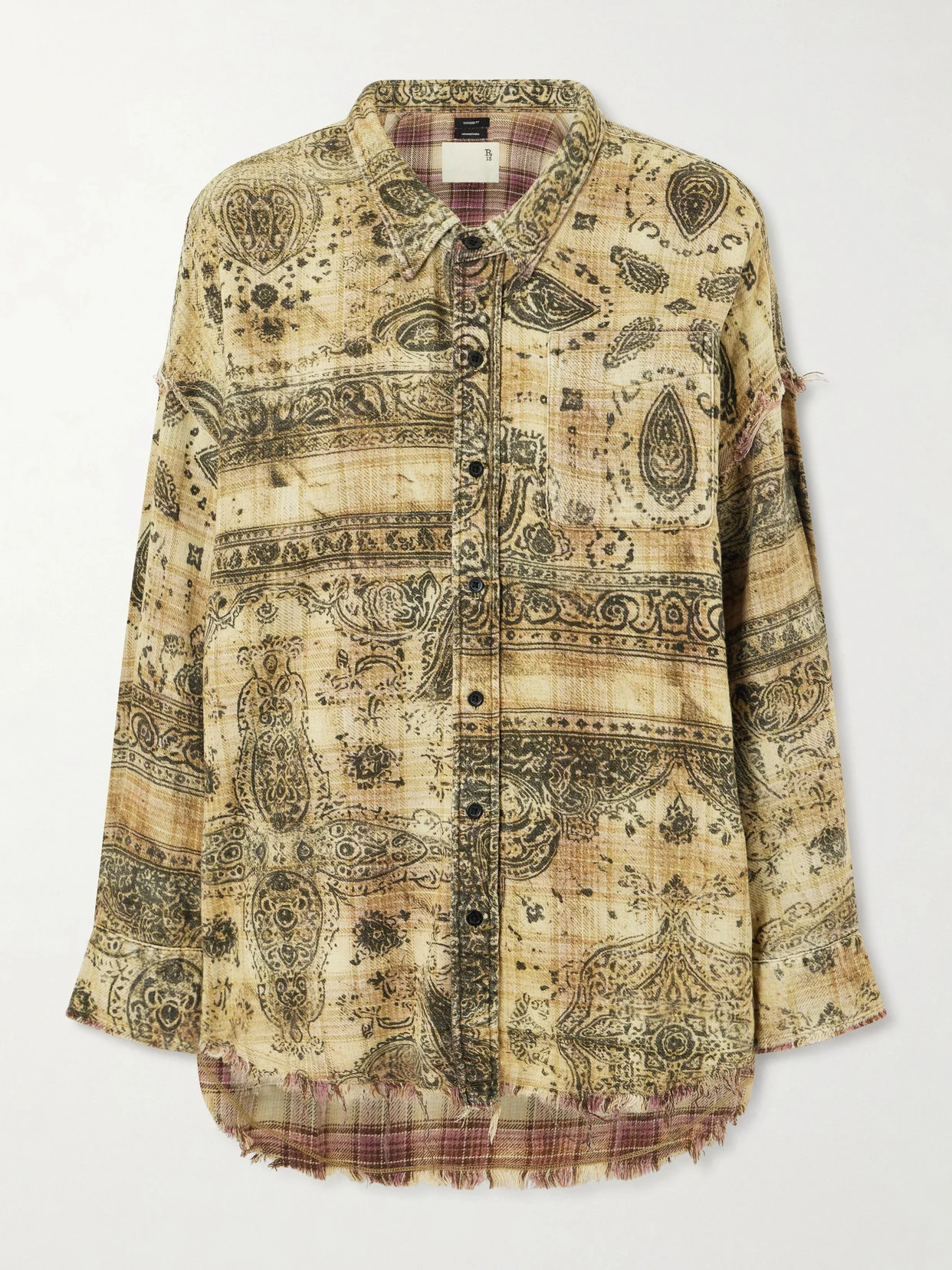 R13's shirt has a distinctly bohemian spirit. Crafted from lightweight cotton patterned with an intricate, scarf-inspired motif, it's cut in a slightly oversized silhouette with a point collar and button-fastening front. Dropped shoulders, a chest patch pocket and frayed hem lend a subtly undone finish.