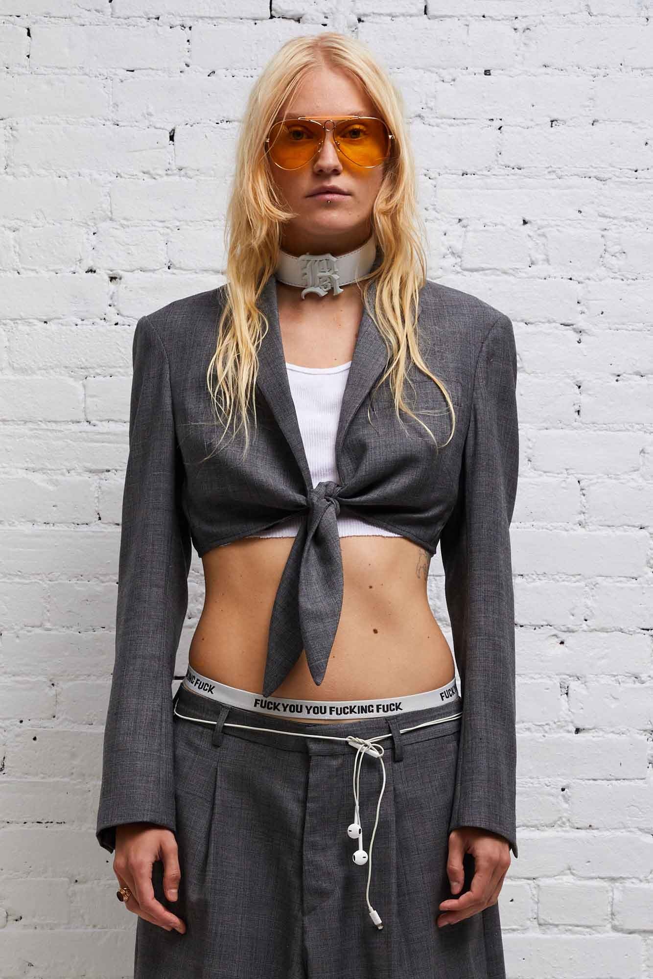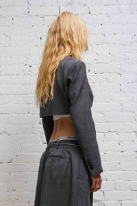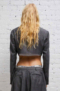 Cropped wool blazer featuring a tie at the front and classic blazer detailing throughout. - Made in the USA - Color: Glen Plaid - 100% Wool - Sasha is 5’10” and wearing size M - Bust 32”; Waist 23”; Hips 35” - R13WR164-R250A