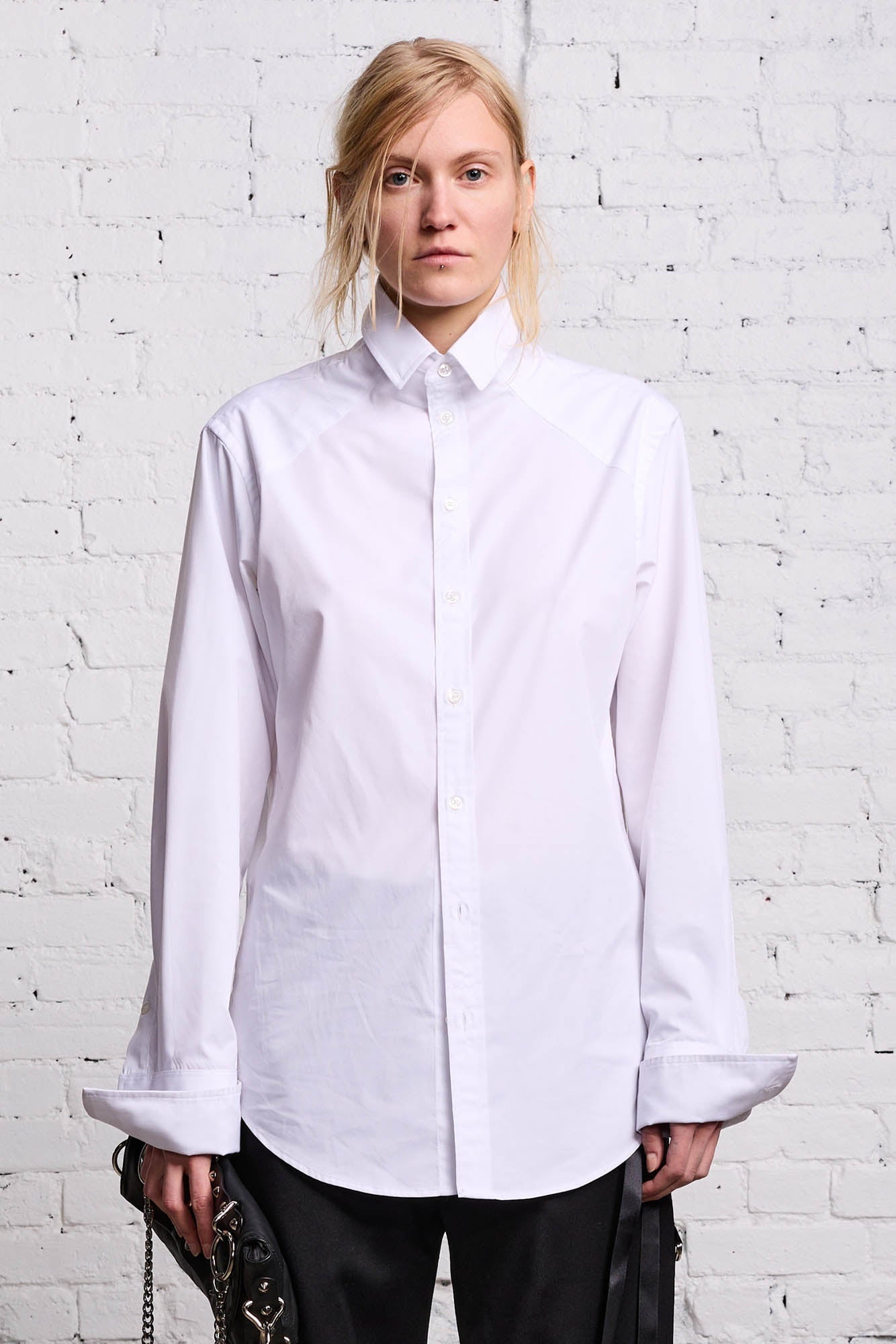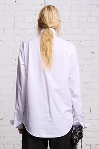 A rehash of the classic button-up shirt featuring an extended collar for a leaner silhouette. - Color: White - Sasha is 5’10” and wearing size M - Bust 32”; Waist 23”; Hips 35” - 50% Rayon, 50% Polyester - R13WR190-R237B - Imported