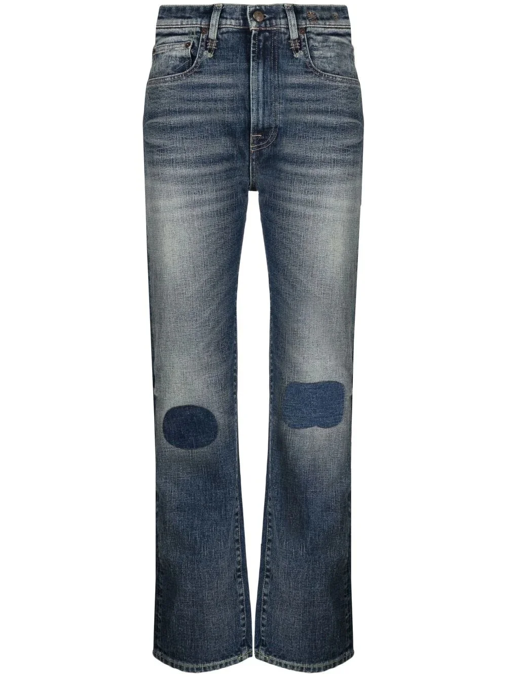 high-waisted slim-cut jeans high-waisted slim-cut jeans from R13 featuring indigo blue, cotton blend, dark wash, whiskering effect, high waist, slim cut, front button and zip fastening and classic five pockets. Made in Italy Composition Cotton 95%, Polyurethane 5% SIZE & FIT Model measurements Height 5 ft 10 in(1.78 m) Bust/Chest 30.31 in(77 cm) Hips 36.61 in(93 cm) Waist 24.8 in(63 cm) FittingInformation This piece fits true to size. We recommend you get your regular size Designed to be fitted at the waist and through the thigh, loose from the knee Made with a mid-weight fabric Washing instructions Machine Wash