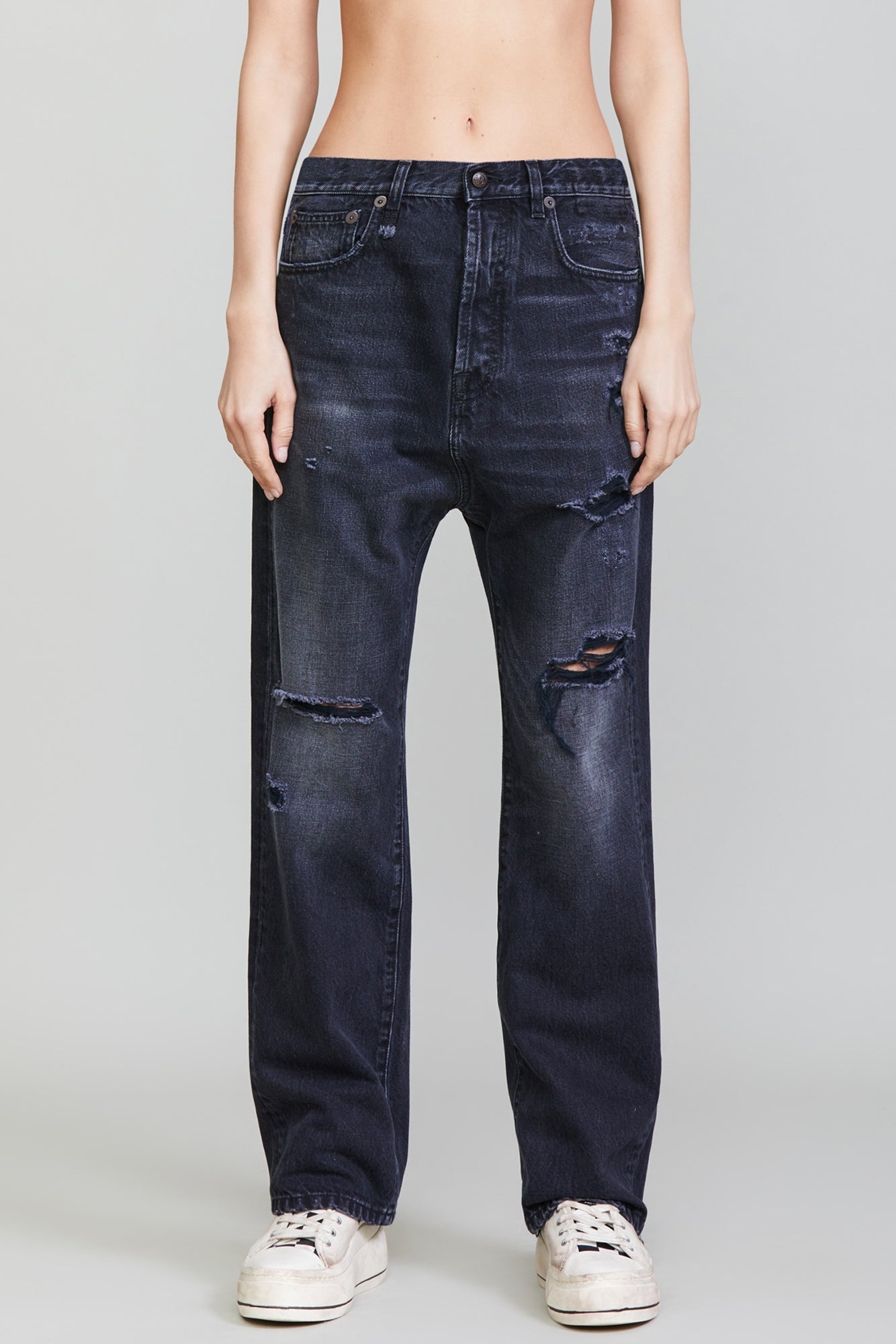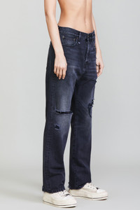 Longer inseam drop crotch jean Made with rigid Italian black x black denim, 13 oz. Mildly worn black wash with some rips and destroyed hem. Made in Italy. - MADE IN ITALY - Color: Jake Black - Skye is 5’11” and wearing size 27 - Bust 30.5”; Waist 24”; Hips 35” - 100% Cotton - R13WD942-394E
