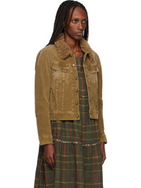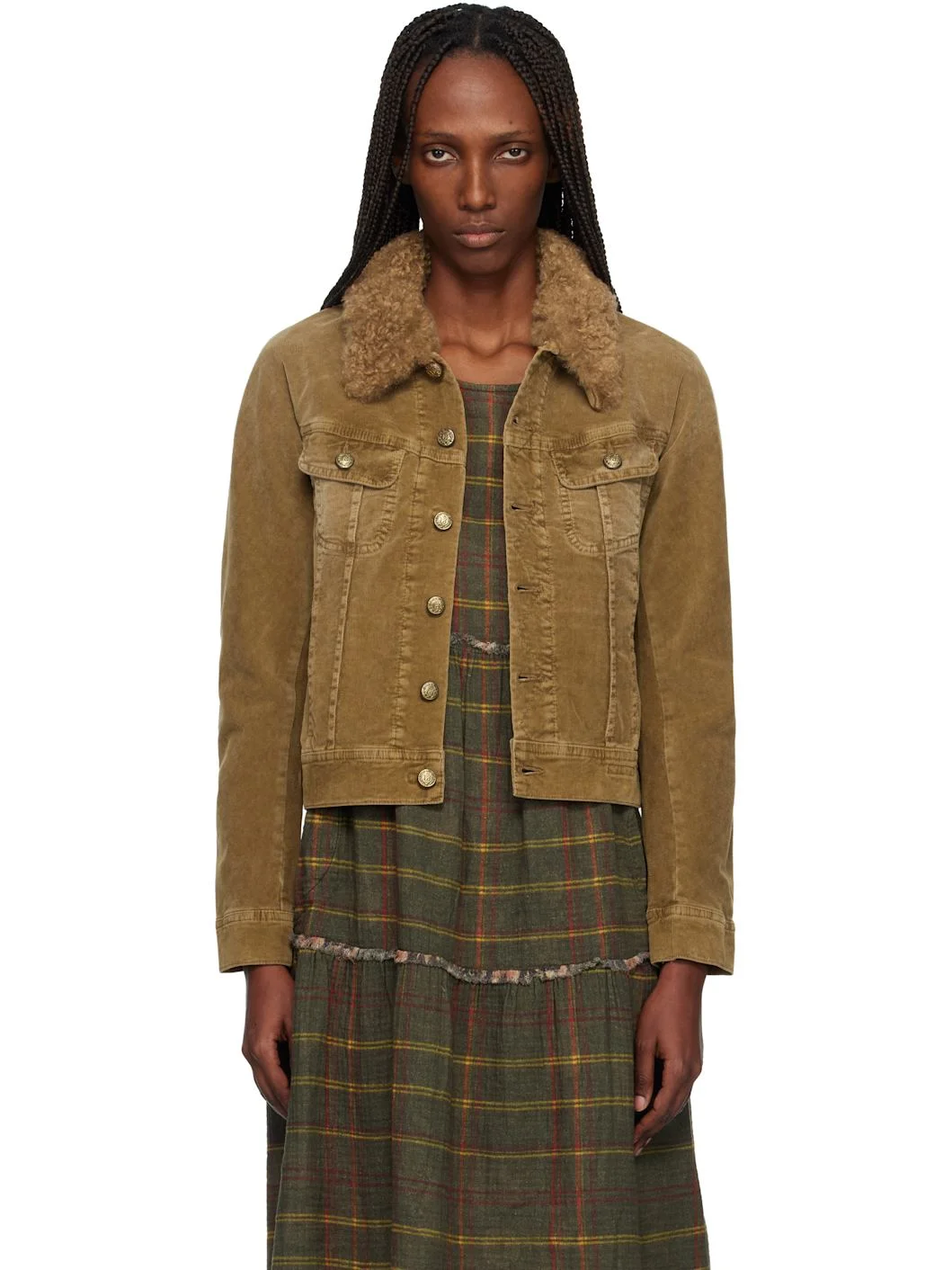 8 oz stretch cotton corduroy jacket. · Faux-shearling trim at spread collar · Button closure · Flap pockets at chest · Buttoned barrel cuffs · Adjustable button tabs at back hem · Full satin lining · Logo-engraved gold-tone hardware Supplier color: Golden brown stretch cord Body: 98% cotton, 2% elastane. Lining: 100% cupro. Made in Italy 252021F062000
