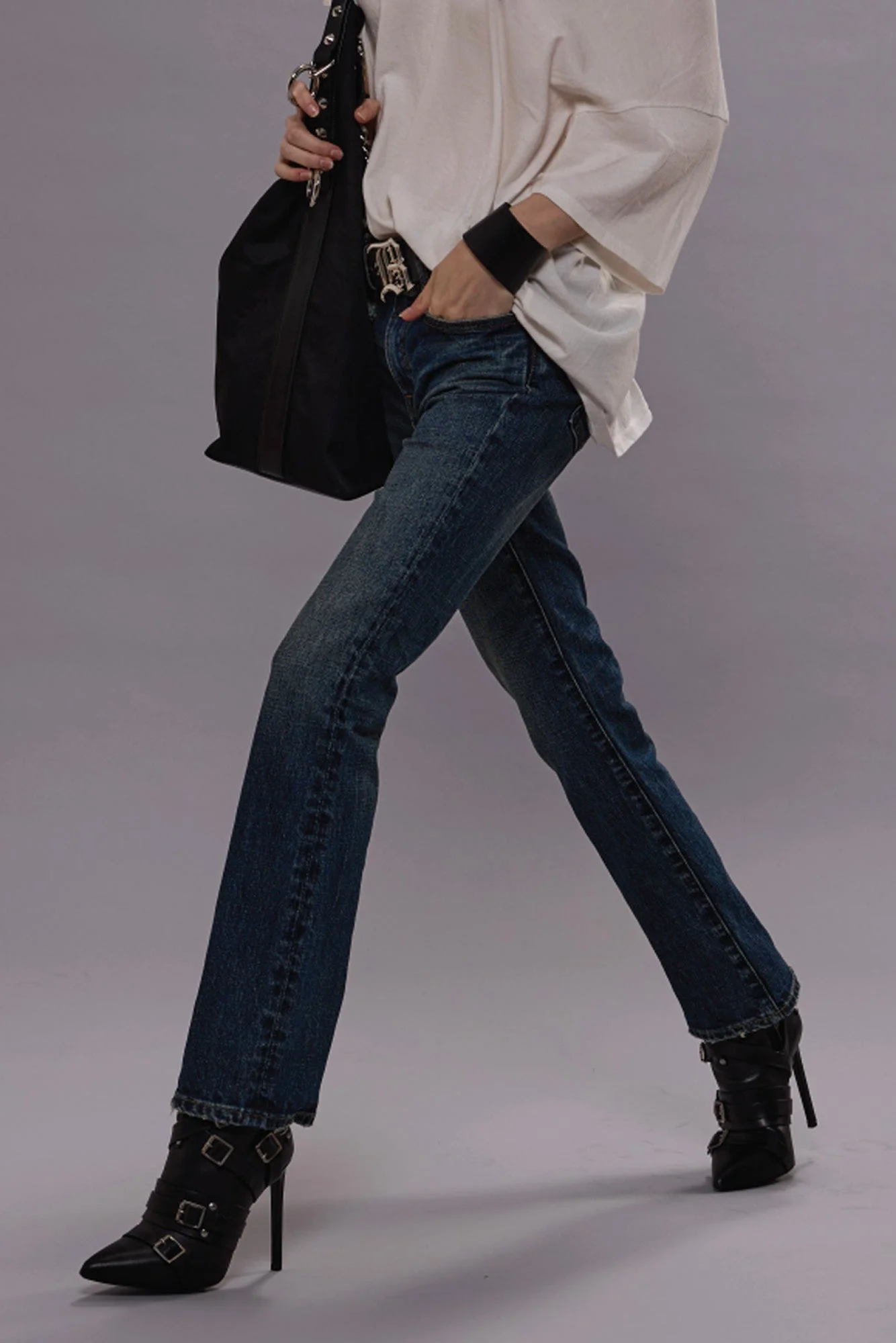 Slim straight cropped jean with a subtle flare made with mid-weight comfort stretch Japanese indigo denim and treated with a dark indigo wash and a gentle wear pattern. - Color: Melvin Blue Stretch - 98% Cotton, 2% Polyurethane - R13W0009-D246A - Imported