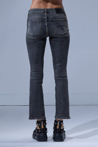 Slim straight cropped jean with a subtle flare built with Italian black stretch denim with a light wash and subtle sanding. DETAILS Made in Italy Color: Leyton Black Stretch 98% Cotton, 2% Elastane R13W0009-D571A