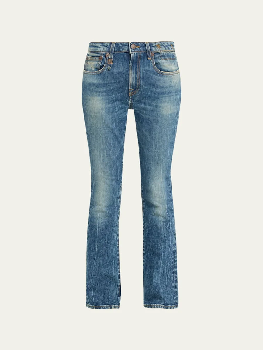 R13 "Kick Fit" jeans in faded mediumwash denim Fivepocket style Mid rise Slim fit Ankle length Button/zip fly; belt loops Cotton/elastane Made in Italy