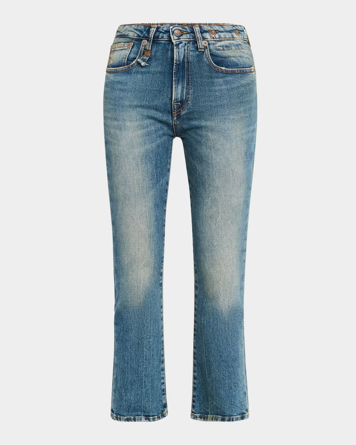 R13 "Kick Fit" jeans in faded mediumwash denim Fivepocket style Mid rise Slim fit Ankle length Button/zip fly; belt loops Cotton/elastane Made in Italy
