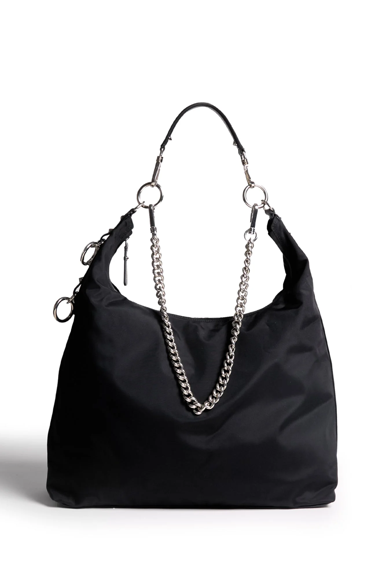 Large nylon hobo bag with harness embellishments, removable leather strap, interior logo pocket and removable chain. DETAILS Made in Italy Width: 18", 44 cm Height: 14", 34 cm Depth: 6", 16 cm Strap Drop (Leather): 13", 33 cm Strap Drop (Chain): 22", 55 cm Features: Interior zip pocket Color: Black Body: 100% Nylon, Strap: 100% Leather R13WA063-A010