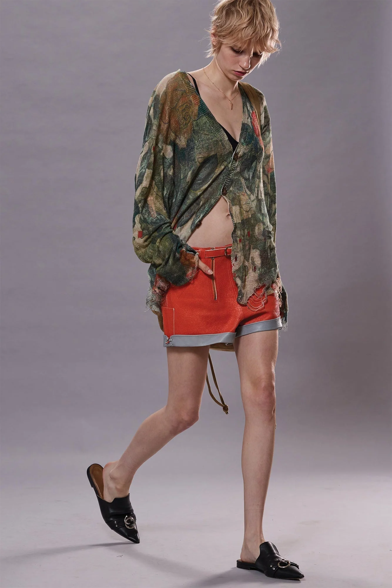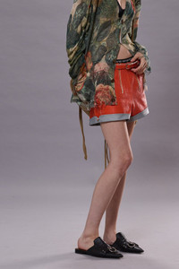 Leather biker short featuring a built in belt and vertical zippers at the front. DETAILS Color: Orange and Light Blue 100% Leather R13WR389-R497A Imported
