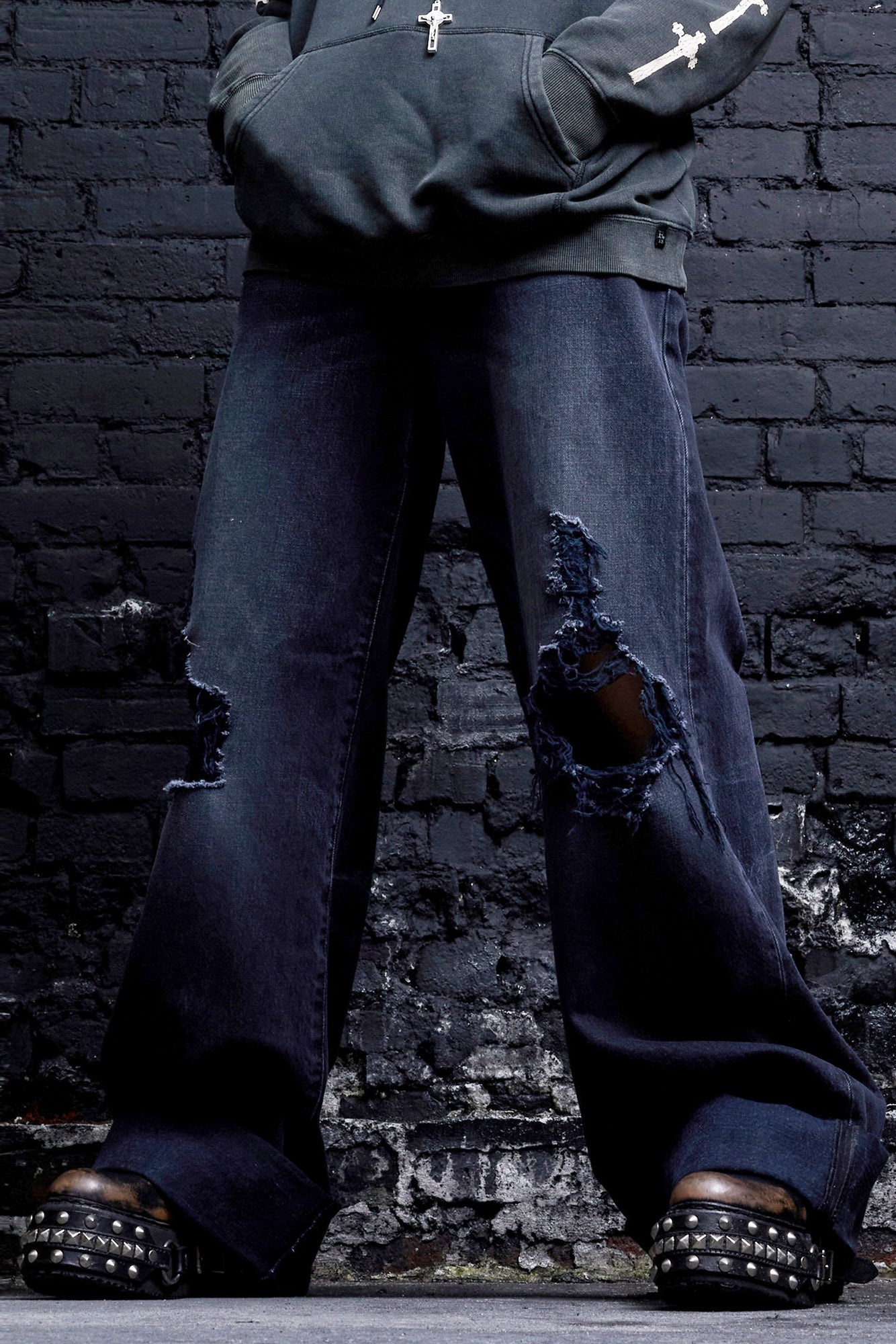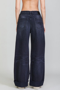 Baggy wideleg jean with cuff featuring a mildly worn black wash and knee rips. Made with rigid Italian black on black 13 oz denim. - MADE IN ITALY - Color: Jake Black - Alecia is 5’9” and wearing size 27 - Bust 32”; Waist 24”; Hips 33” - 100% Cotton - R13WD041-394D