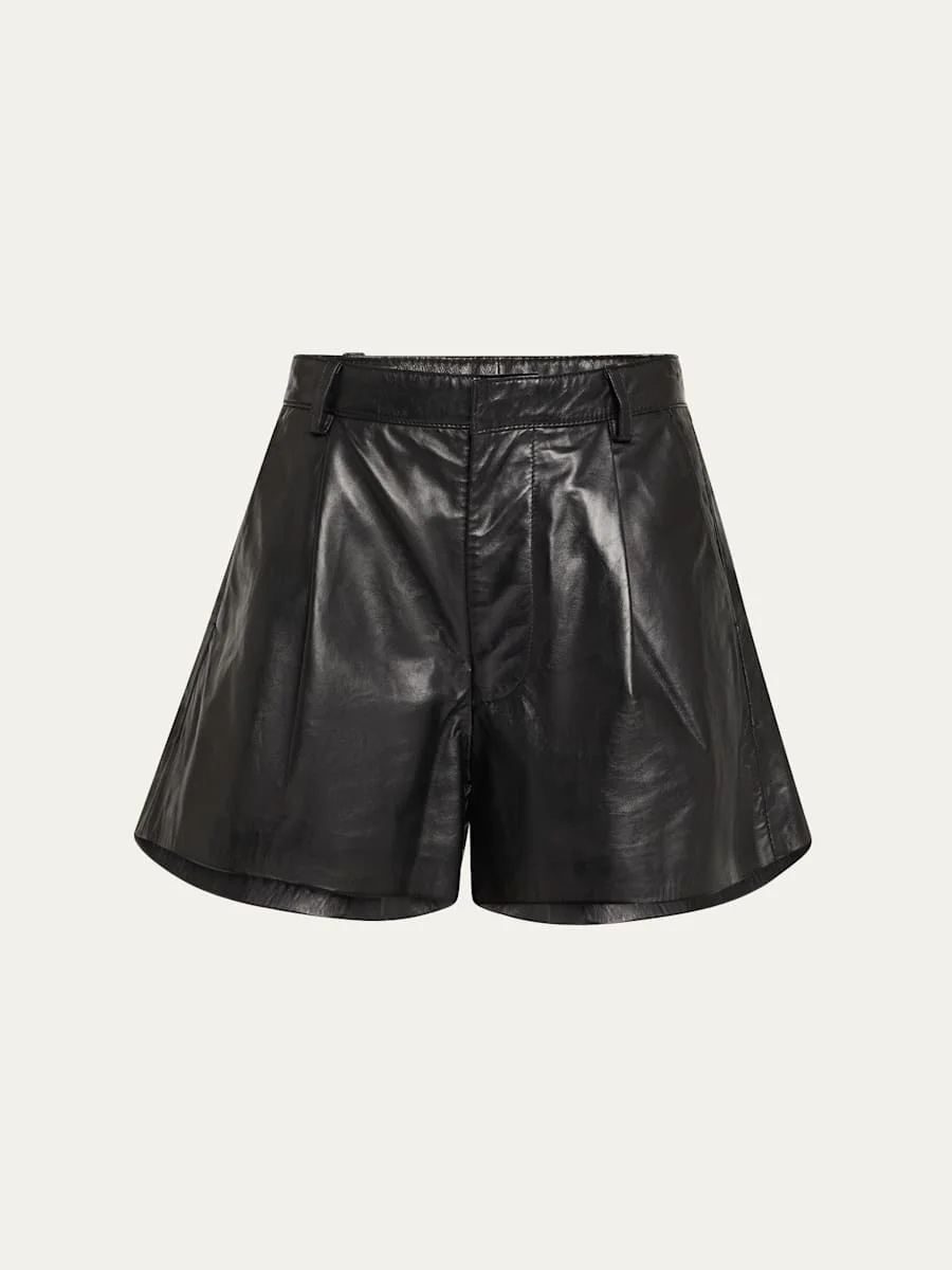 R13's smooth calf leather shorts add an edgy touch to any look Mid-rise; sits high on the hip Side pockets Wide, loose fit Snap/zip fly; belt loops Leather Leather method dry cleaning Imported Online Inquiries: BGS21_T6U20| Store Inquiries: #5035055