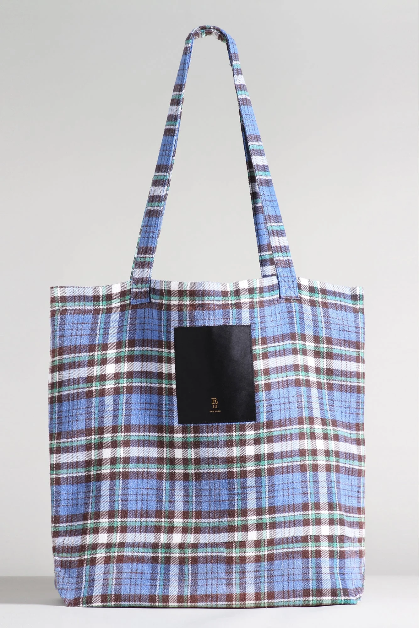 Medium sized tote bag featuring a quilted interior lining and an R13 label on the exterior. Made from Japanese plaid. - Color: Blue and Green Plaid - 100% Cotton - R13WA029-R146B