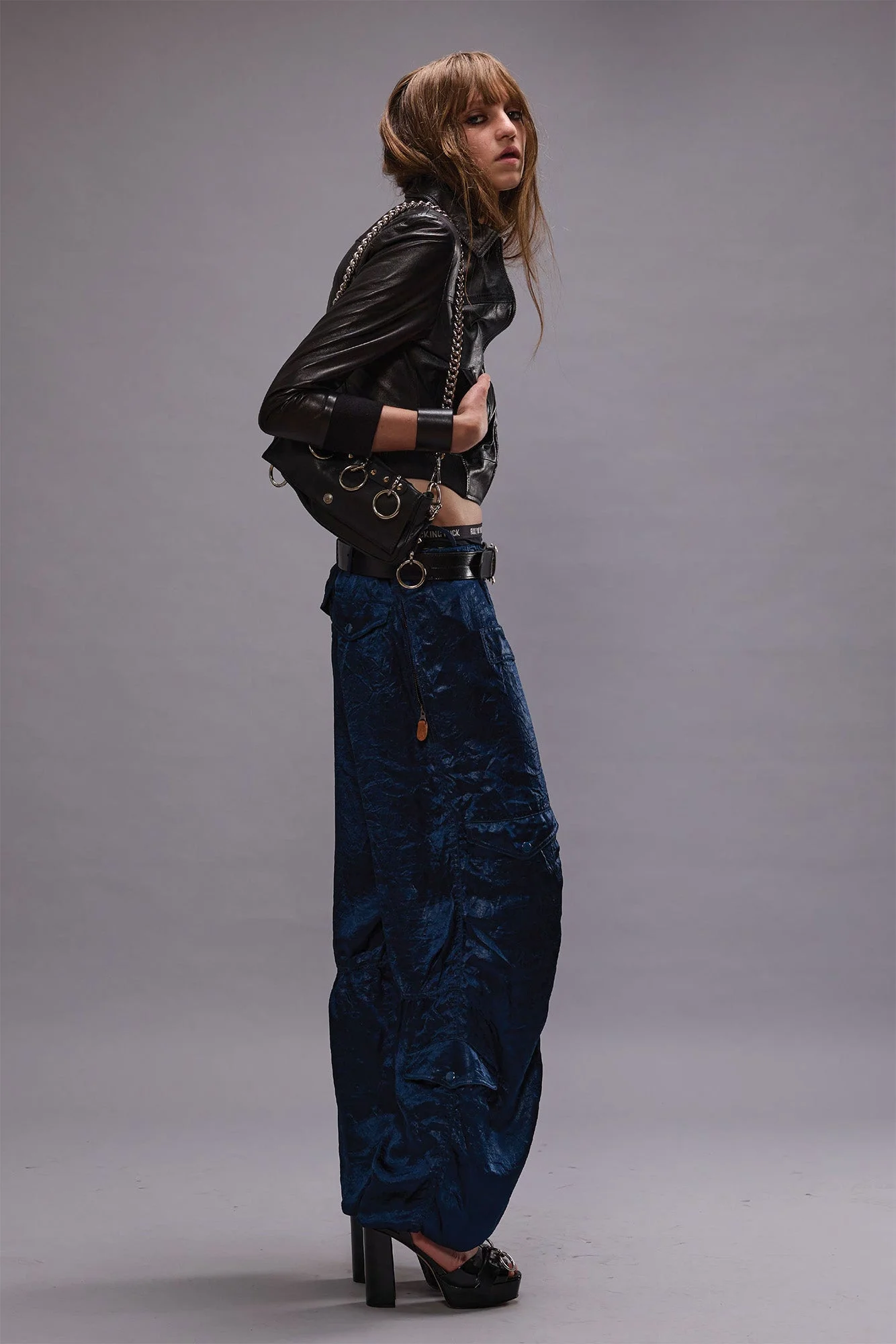 Baggy oversized balloon pant featuring drawstrings and multiple zip pockets throughout.This style runs slightly large. If in between sizes, we recommend sizing down. - Made in the USA - Color: Navy - 100% ACETATE - R13WR351-R453B