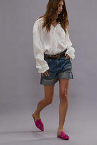 High rise relaxed denim short built with mid-weight Japanese rigid indigo denim and treated with a medium indigo wash and mild wear pattern. DETAILS Color: Barter Indigo 100% Cotton R13WD110-D213A Imported