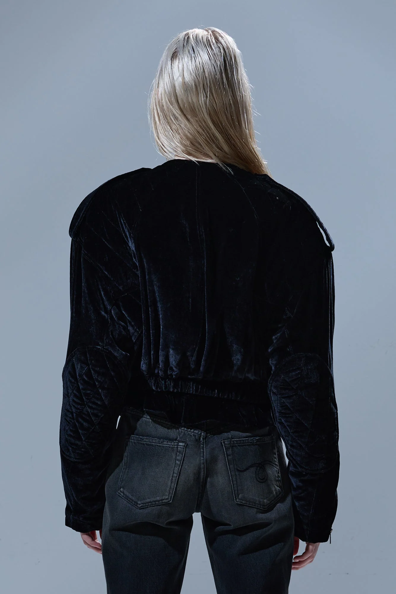 Oversized cropped collarless moto jacket built with Italian crushed velvet. DETAILS Made in the USA Color: Black 80% Viscose, 20% Silk R13WR499-R633A
